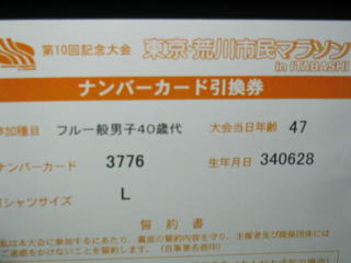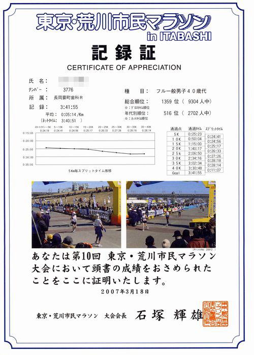 平成平成19年3月18日 東京都の「第10回東京・荒川市民マラソン大会」のフルマラソンに参加しました。
