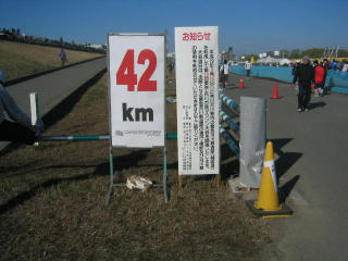会場には42キロの看板があり、ここまで走りきれば感動のゴールはあと200mなどと考えます。