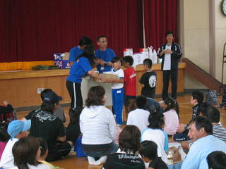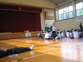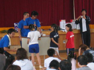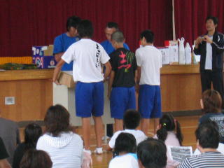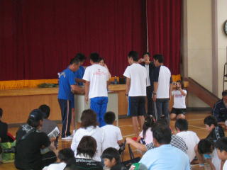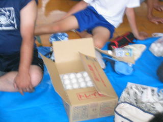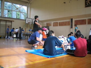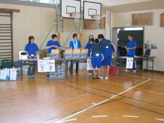 体育館の片隅にブルーシートが貼ってあり、シューズ置き場となっています。