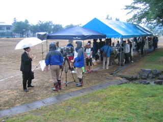 バスに乗ってスタート場所の城内中学校へ移動、雨が降ってきました。
