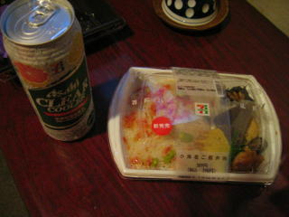 午後7時、フロントの電子レンジで弁当を温め、宴会開始です。