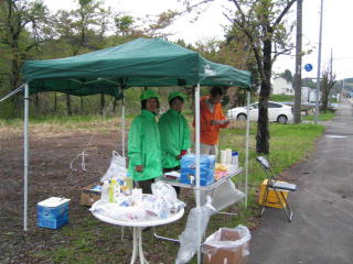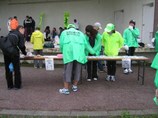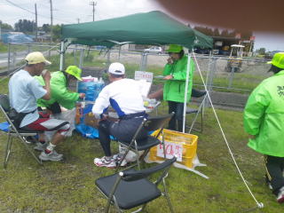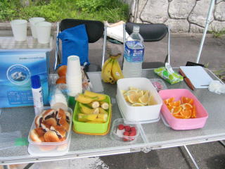 主催者側が水、スポーツドリンク、果物、アンパン、スプレーなどを用意しています。