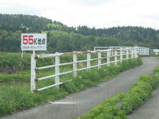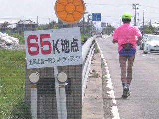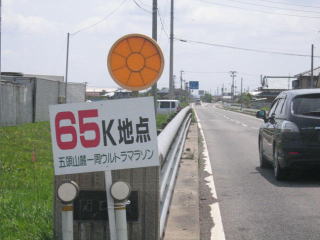 歩道のない道をひたすら走り、弧線橋を渡りきると65キロです。