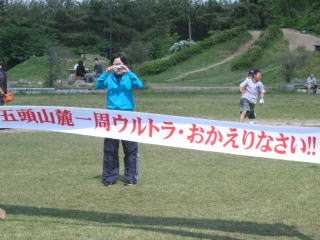 「五頭山麓一周ウルトラ・お帰りなさい!!」のゴールテープが迎えてくれます。