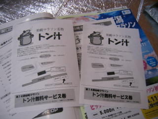 「トン汁」の券もなぜか2枚、温泉の割引券、ブルボンのスローバー(チョコレートクッキー)もあります。
