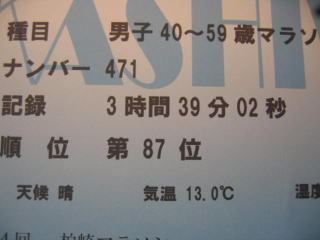 昨年より2分ほど遅い3時間39分でした、今の体調を考えれば上出来です。