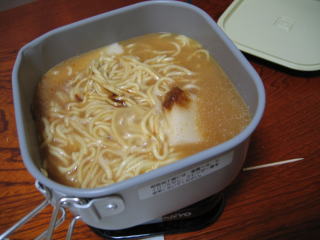 予定通り2時に起きて、インスタントラーメンにお餅を4個入れて朝食です。
