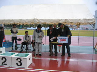雨ですので傘をさして100mほど先の陸上競技場へ向かいます。