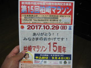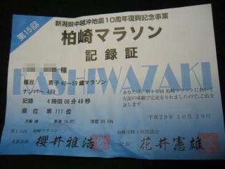 平成29年10月29日 柏崎市の「第15回柏崎マラソン大会」のフルマラソン(フル98戦目)に参加しました。