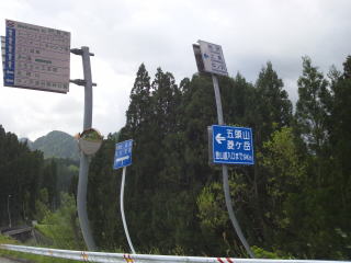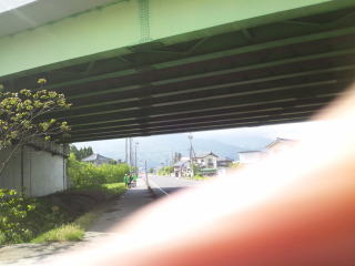 高速道路の下に12キロ給水所が見えてきました、写真の右下のピンボケなモノは姫ちゅの指です。