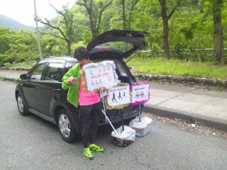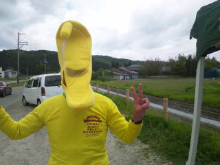 50キロエイドでは、走れば優勝の可能性も充分な、岡部のバナナなたかさんが今年はエイドを務めています。