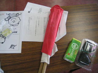 大会要綱、補助員活動要綱・配置書、腕章、キャップ、赤白の旗、おにぎり、お茶をいただきました。
