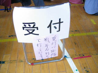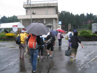 傘をさして、受付会場の小千谷市旧川井小学校へ入ります。