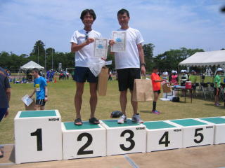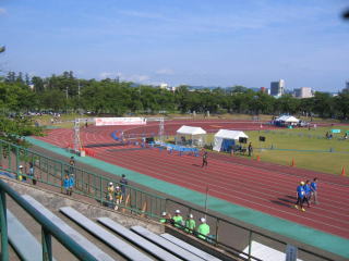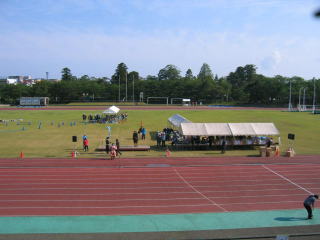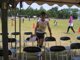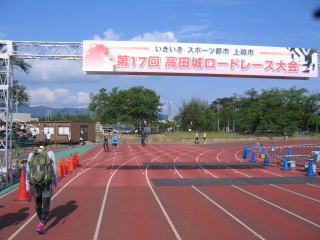 陸上競技場外のスタートラインからスタート、昨年より4分遅いタイムでゴールしました。