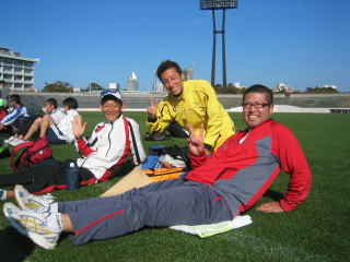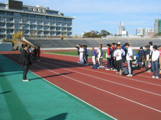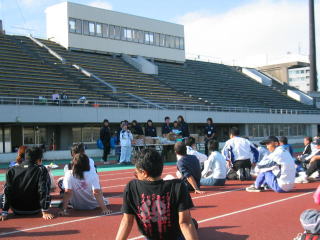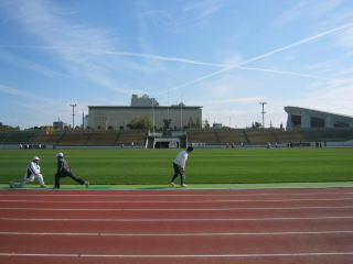 陸上競技場でも皆さんストレッチ中。