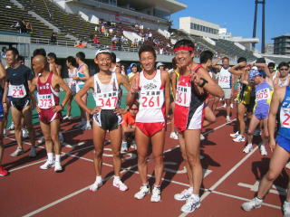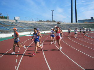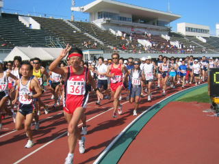 陸上競技場を1周と3/4周して市街地コースへ出て行きます。