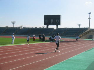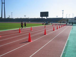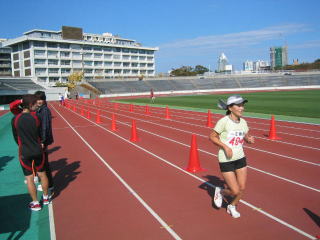 姫ちゅもゴール目指して陸上競技場脇をヨロヨロ走り中。