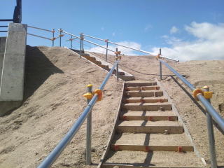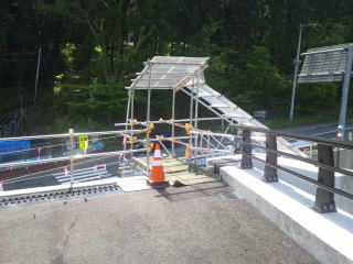 仮設の階段を歩いて上り、工事中の橋を渡り、向こう岸で再び仮設の階段を下ります。