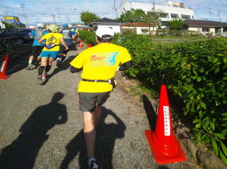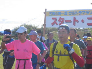 午前7時、個人の部は71人のエントリーで出発、今年はコースベストの6時間33分、悪くてもキロ6分で7時間以内が目標です。