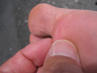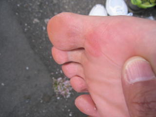 駐車場の車止めに腰かけて、安全ピンで水ぶくれをつぶしゲンタシンを塗っておきました。