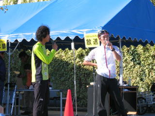 緑の方が総合プロデューサーのトレイルランナーズの松永さん、白い方が富士山登山競争の優勝者、違っていたらすみません。