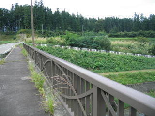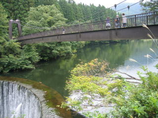 堰から流れる川の上に旭原橋がかかっています。