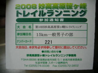 平成20年8月24日 妙高市の「2008妙高高原笹ヶ峰トレイルランニング」の15キロに参加申し込みをしていました。 事前にナンバーカードを知らせるハガキが届きます。 当日起きたらかなりの雨だったので、出発自体を取りやめました。 これで雨によるDNSは3回目です