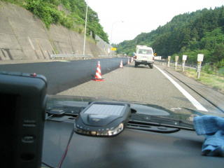 北陸自動車道は中越沖地震の復興工事中、左右車線の高低差は30センチほどあるようです。