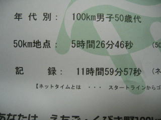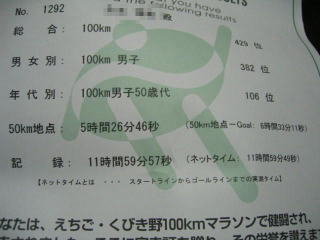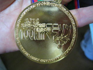後半も2回トイレに寄ってイマイチな走りでしたが、エイドのボランティア、沿道の応援に助けられ、なんとか初100キロ無事ゴール。