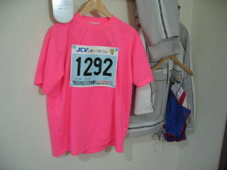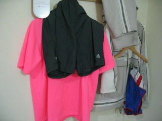ウェアは蛍光ピンクの大きいサイズのTシャツです。