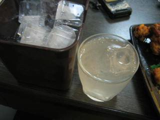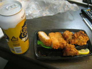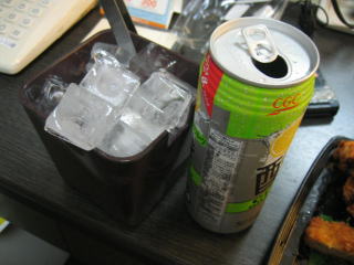 持参したビールと唐揚げやとんかつで宴会、氷はフロントでもらいました。