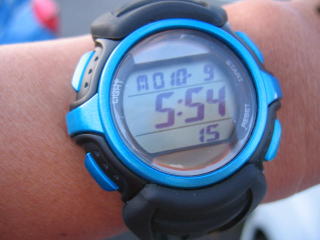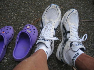 まずはシューズからサンダルに履き替えます、左足スネの白いツブツブは体から噴いた塩です、そしてその場で着替えました。
