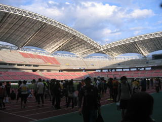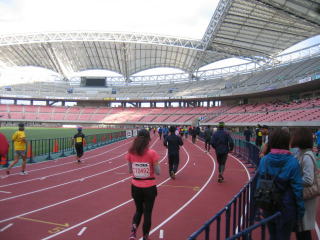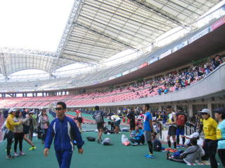 ウォーミングアップしているランナー、上の観覧席で休憩するランナーなど見えます。