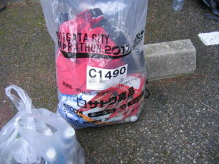 事前にナンバーカード2枚、計測チップ、参加賞、荷物預け袋、大会プログラム&参加者名簿などが届きます。