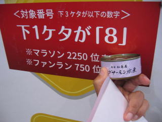 マラソン2250位までで下1ケタが「8」でした、新潟では有名な「加島屋」さんの「キングサーモン水煮」缶詰が当たりました。