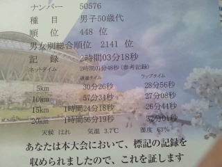 記録は2時間03分18秒、ネット2時間01分48秒、17キロから歩いた割には頑張りました?