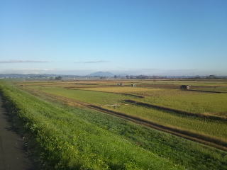 目的地の弥彦山が遠くに見えます。