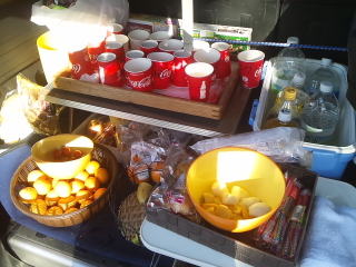 中島エイドカーにはたくさんの飲み物やくだもの、アンパン、チョコレート、ランナーのリュックなどを積んでいます。