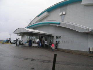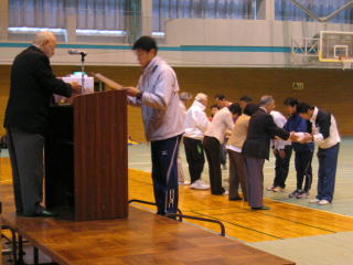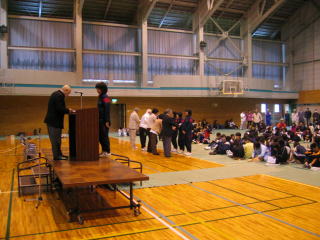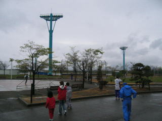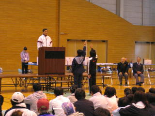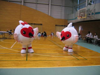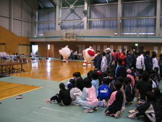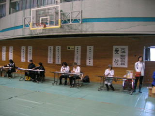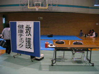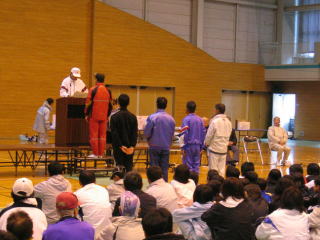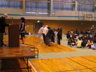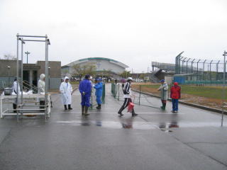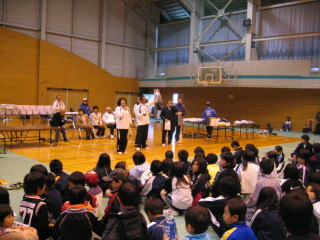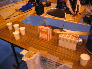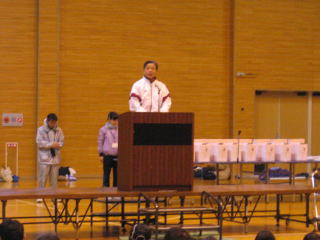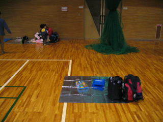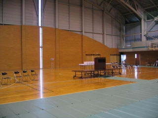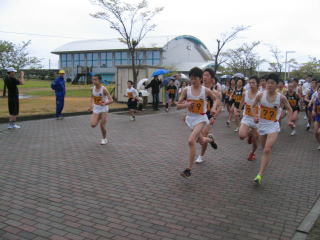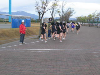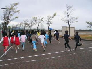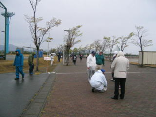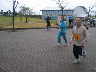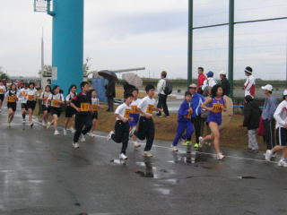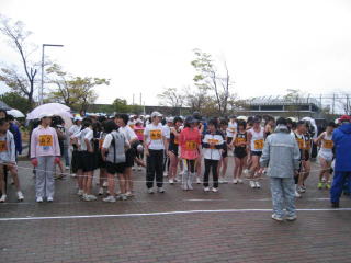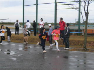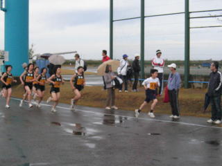 風が強いので、ゴール後の給水は体育館の中へ移動したようです。