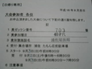 事前にゼッケンと休憩施設(温泉旅館)を知らせるハガキが届きます。