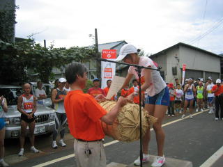 北海道マラソン優勝のご褒美として表彰、お米1年分60キロの俵1表が贈呈されました。