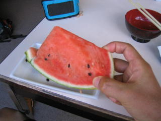 食堂のテーブルの上にはスイカ、お新香が置いてあり、自由にいただくことができます。