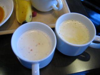 コーンスープとクラムチャウダースープ、熱かったので牛乳で冷ましていただきました。