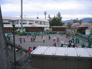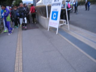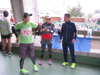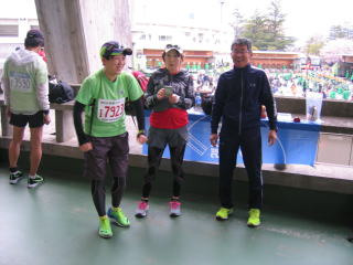 長岡からのマラソン仲間と荷物預けトラック後方の「陸上競技場」階段上で「壮行会」です。