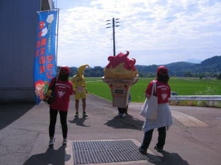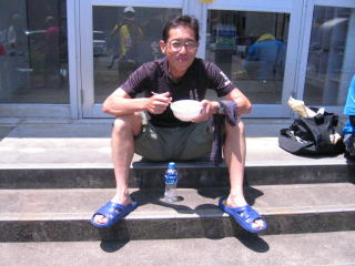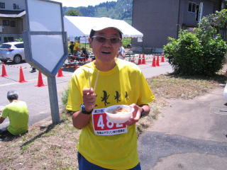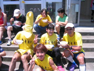 こちらのバナナのドラたかさんは、足に怪我で出走せず、スタッフとなりスタート前からとん汁試食係の様です。