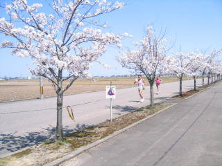 その後、新幹線の下を走り、桜の咲く田んぼ道へ向かいます。