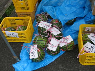 名産の「八色スイカ」は売約済みで名札の付いた物もあります。