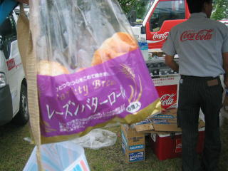 ベルツ温泉センターの駐車場で朝ごはんの残りのおにぎり、参加賞の牛乳をいただきました。