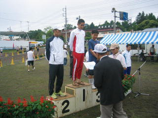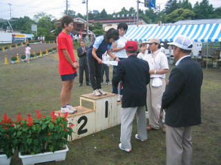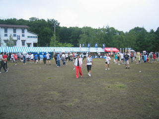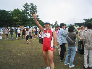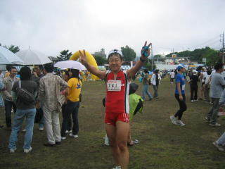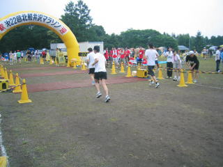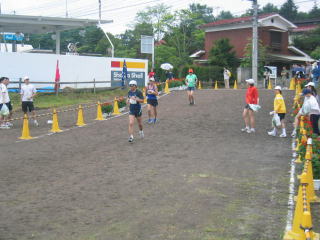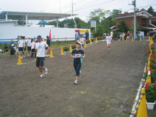 ハーフの表彰式が始まる中、ドンドン道路からグランドへ駆け込んできます。