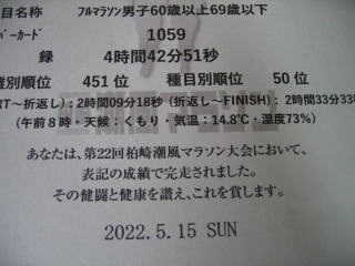 自分でプリントアウトした完走証は4時間42分51秒、種目別順位は50位(参加申込数90名)でした。